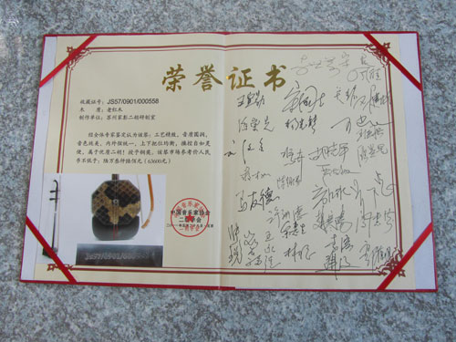 琴體采用蘇州傳統(tǒng)蟲膠擦漆工藝,手工拋光打磨,可清晰顯露出紫檀木細(xì)密的毛孔,整琴制作精致細(xì)膩,演奏手感非常舒適,上下?lián)Q把輕松自如,有利演奏技巧的發(fā)揮